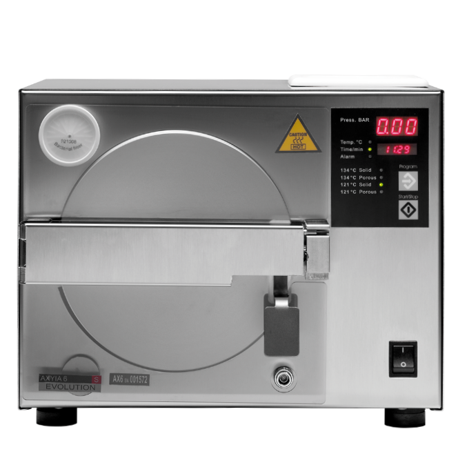 E' l'autoclave di classe S progettata appositamente per la sterilizzazione dello strumentario professionale. L’autoclave AXYA 6, con la sua capacità di 6 litri, garantisce una sterilizzazione sia di strumenti solidi (non imbustati) sia di strumenti porosi (imbustati). La sua grafica chiara ed essenziale la rende un compagno di lavoro user-friendly. Compatta nelle dimensioni, ma al tempo stesso capiente, grazie ad una camera di 6 litri. Ha un design pulito ed essenziale, che le permette di essere collocata ovunque, comodamente. Il sistema di apertura manuale e l'interfaccia grafica, chiara e intuitiva, rendono ogni operazione facile e ancora più sicura. Conformi alla norma ISO 11140-1, gli indicatori multi-parametro MP200, atossici e senza piombo, sono disegnati per valutare i parametri di sterilizzazione con una lettura semplice e immediata del viraggio di colore.